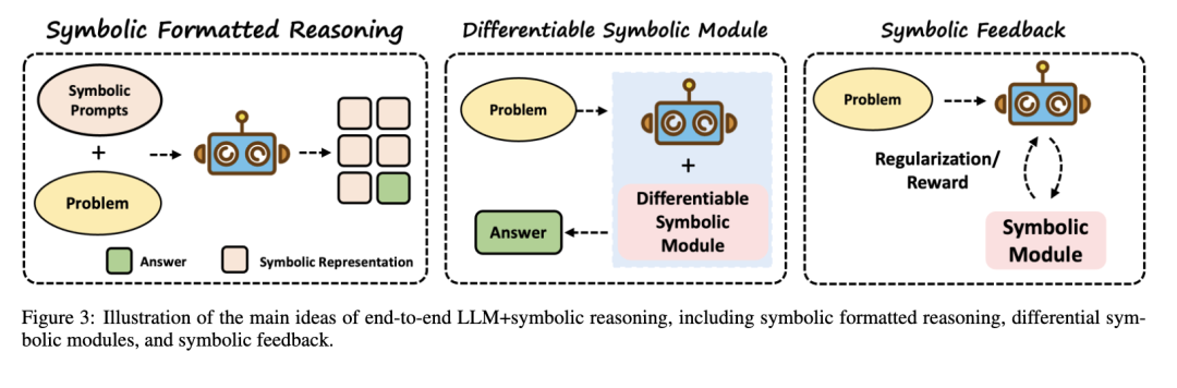 神经符号 AI 的一个“圣杯”级问题,是设计一种机制,使符号方法与神经网络能够以更混合(hybrid)或端到端(end-to-end)的方式协同工作。具体而言,本文从三个视角综述该方向上关于 Symbolic+LLMs 的探索:符号格式化推理(symbolic formatted reasoning)、可微分符号模块(differential symbolic module)和符号反馈(symbolic feedback)。其核心思想如图 3 所示。