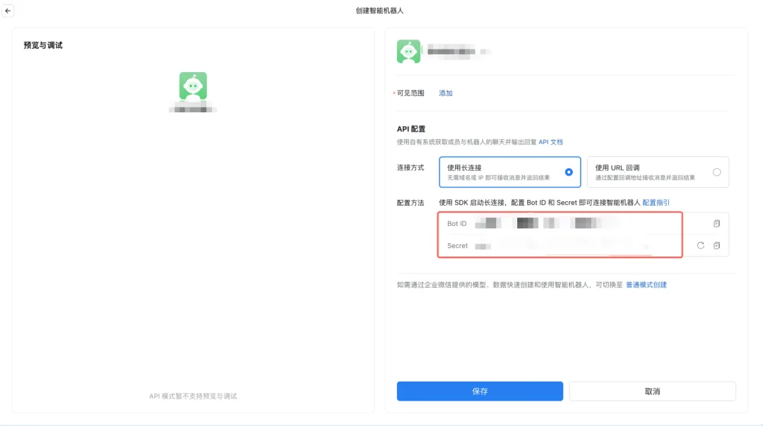 获取Bot ID和Secret并保存。