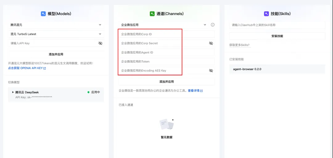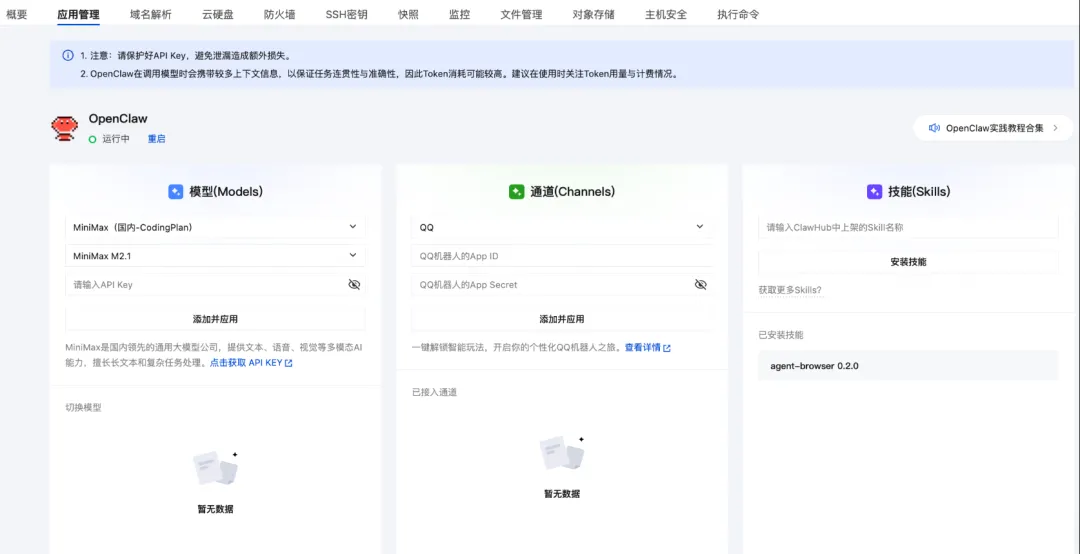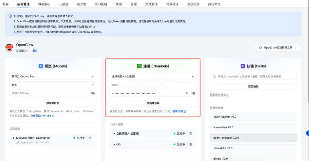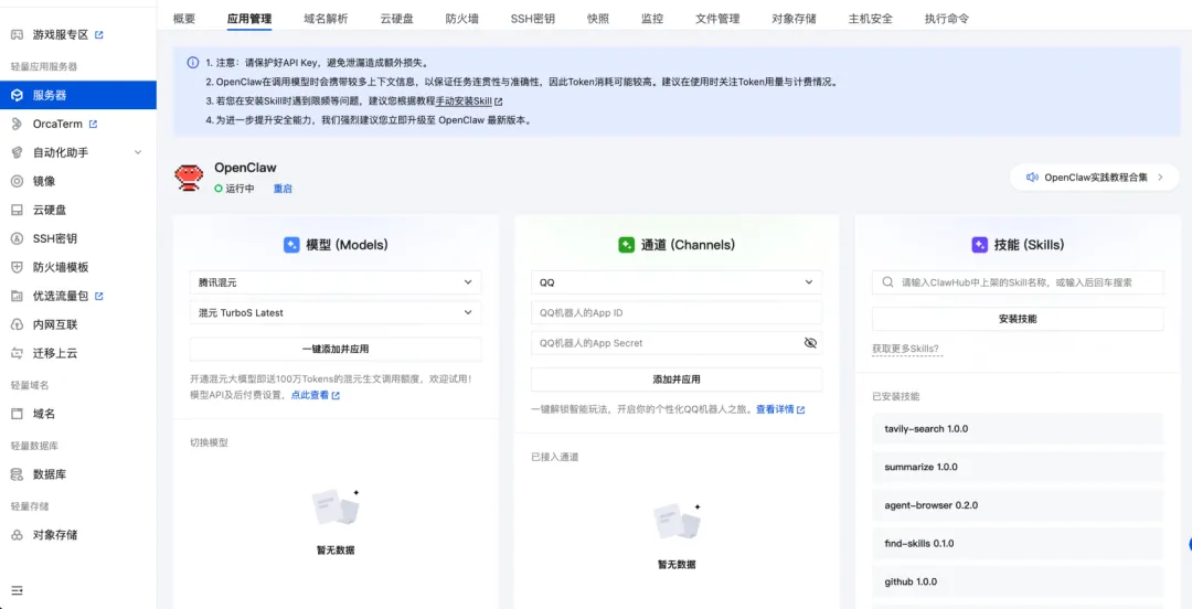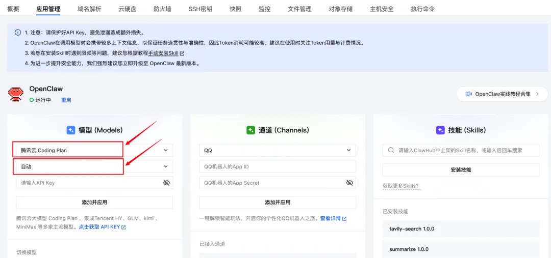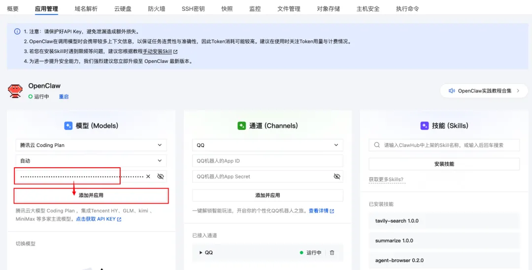 腾讯云轻量应用服务器控制台提供可视化面板,支持一键配置多种模型API Key。