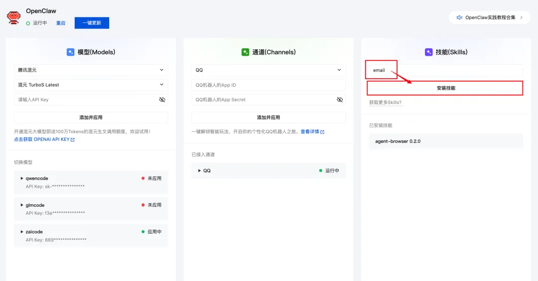 安装Skills有多种方式,这边选择通过可视化操作,即通过OpenClaw配置面板安装。