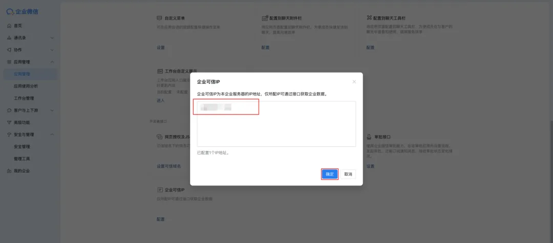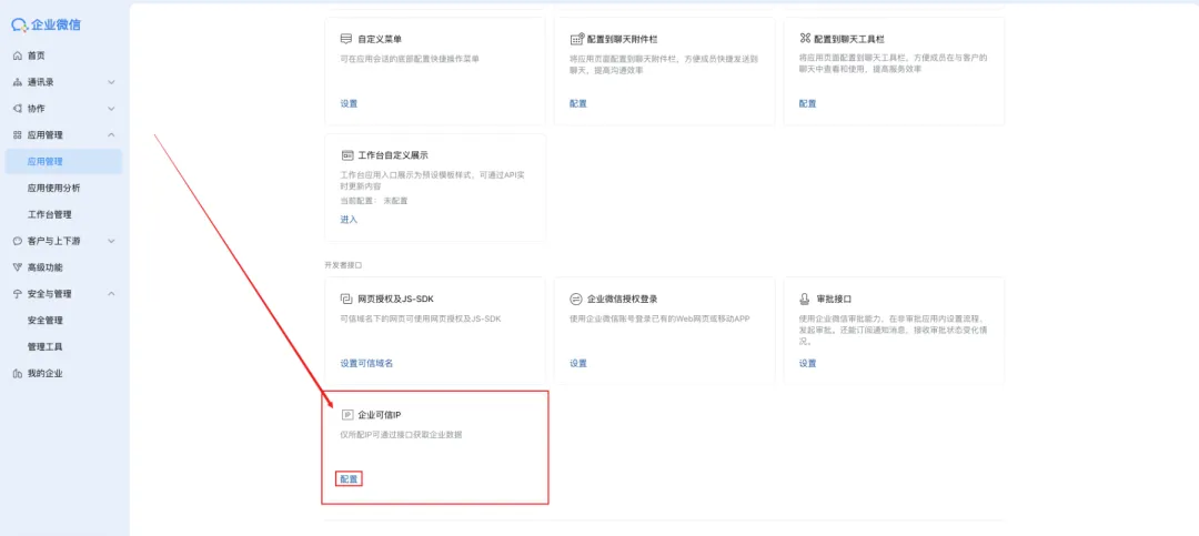 在企业微信应用管理详情页,配置企业可信IP。