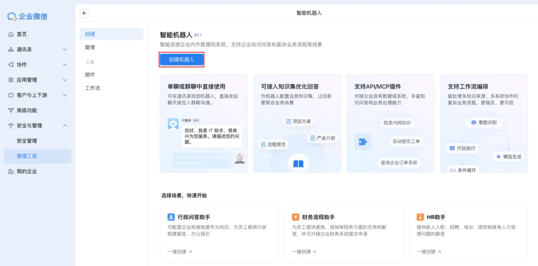 导航至:安全与管理 > 管理工具 > 智能机器人 > 创建机器人。