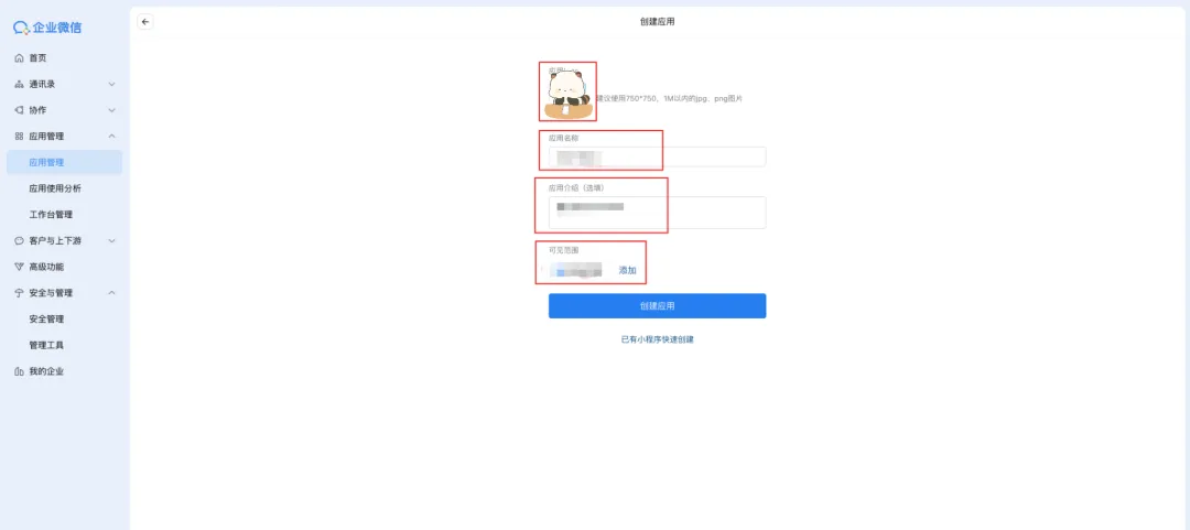 点击"创建应用",设置应用Logo、名称、介绍和可见范围。