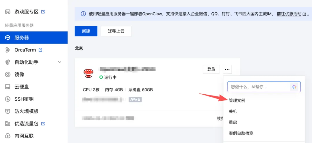 进入服务器控制台,选择已部署OpenClaw的实例。