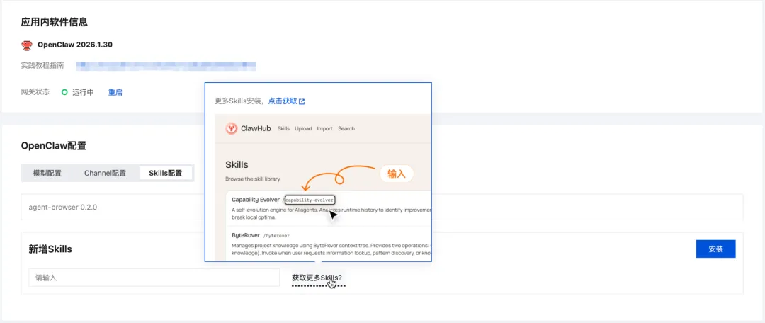 在"OpenClaw配置/Skills配置"页签中,找到新增Skills的输入框。