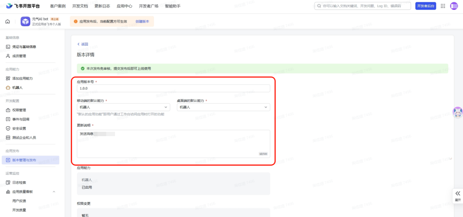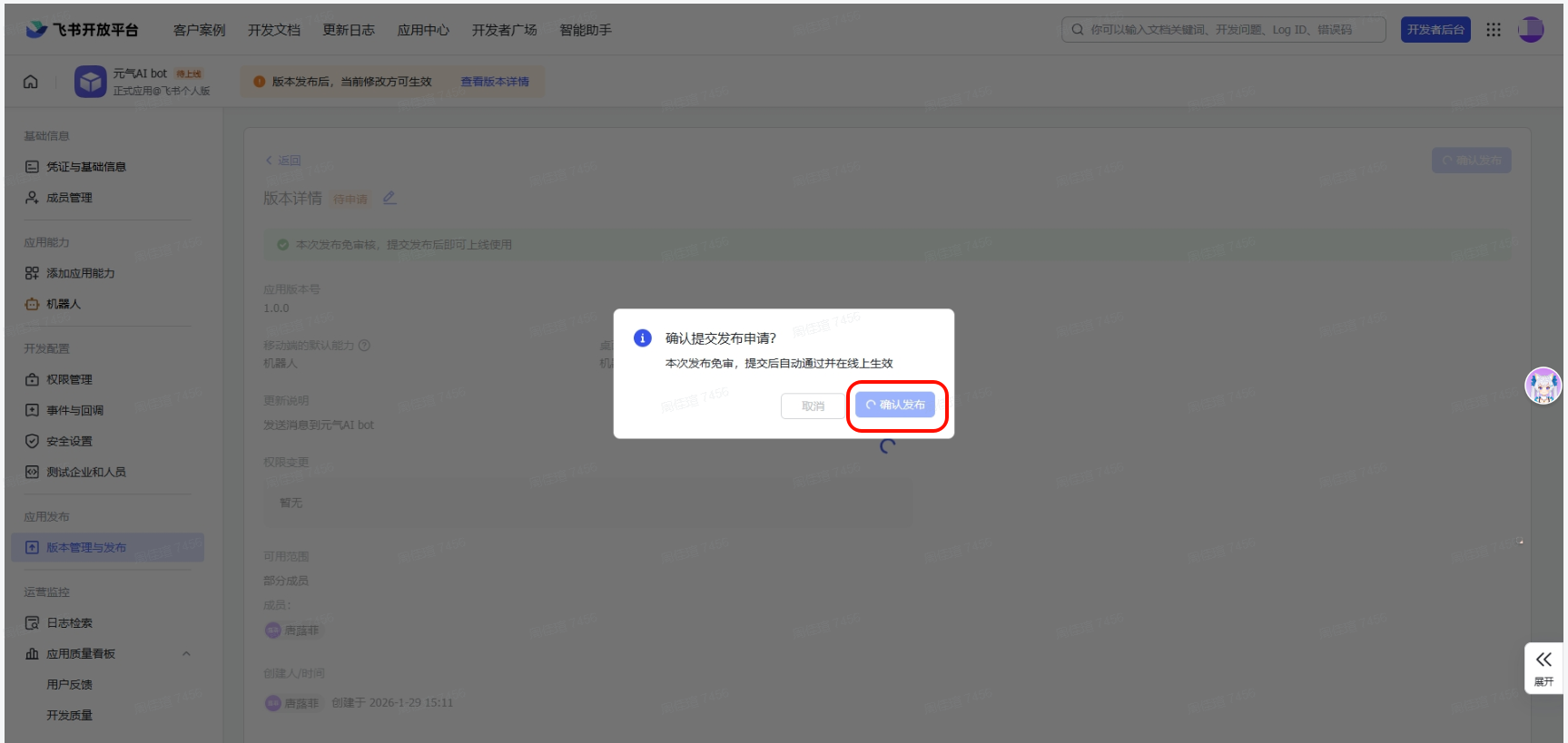 6. 发布应用:进入 “版本管理与发布”,创建 1.0.0 版本,提交发布(个人账号无需审核,几分钟内显示 “已发布”)。