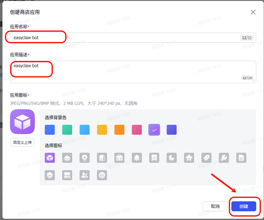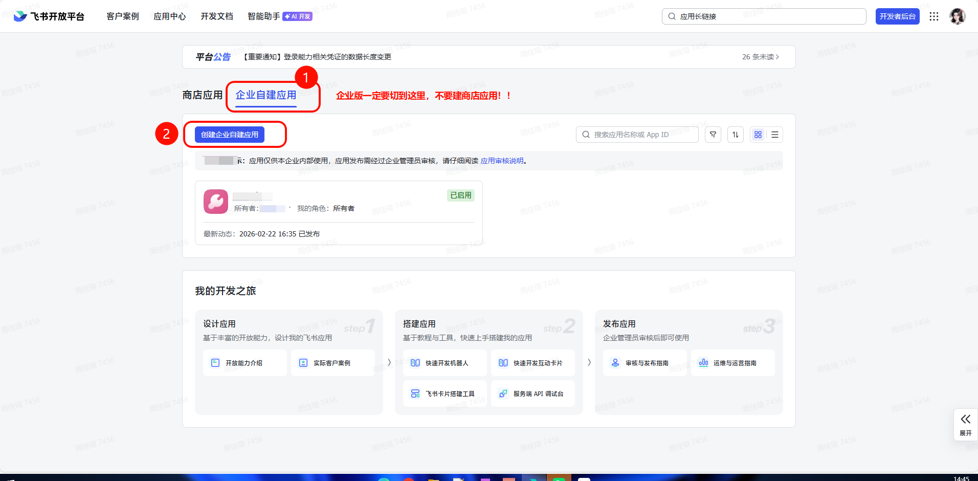 2. 创建企业自建应用:点击右上角 “开发者后台”,选择 “企业自建应用”,填写应用名称(如 “OpenClaw 办公助手”)、描述、图标,点击 “创建”;