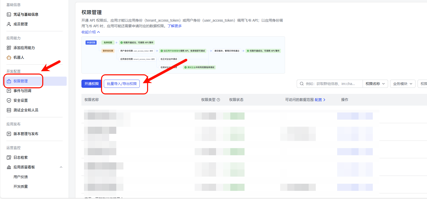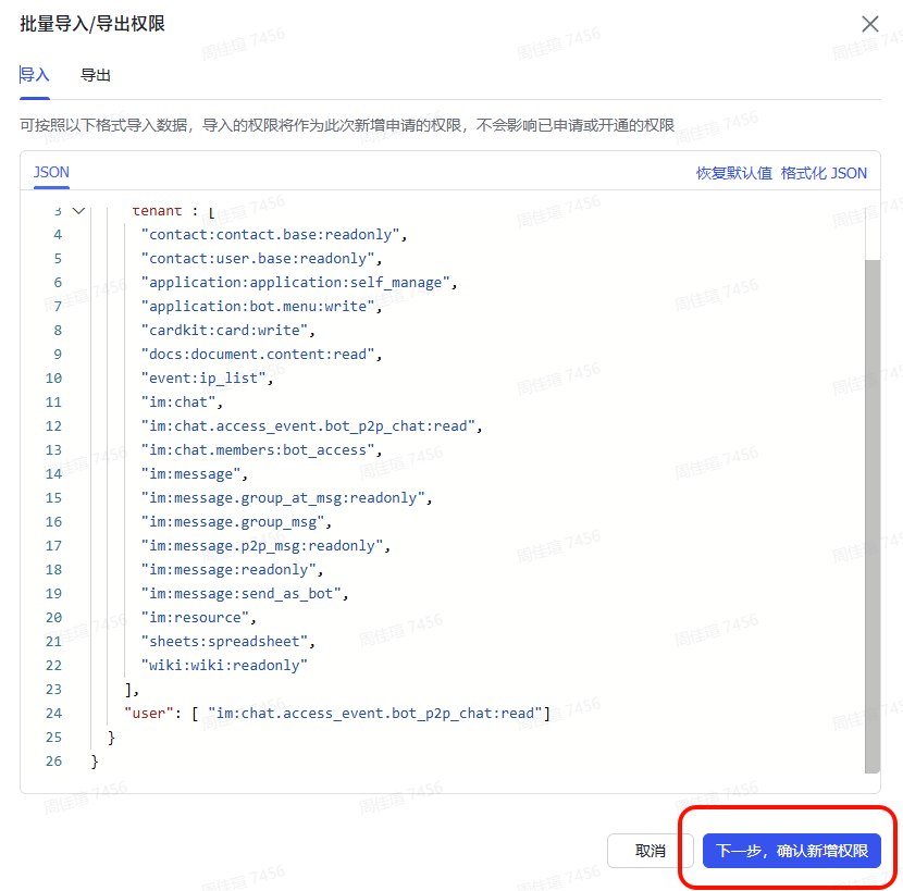 1. 权限管理:申请必需权限 ——im:message(获取与发送消息)、im:message:send_as_bot(以应用身份发消息)、im:chat(读取聊天信息),选择 “自己” 作为授权范围,提交申请(个人账号秒通过);