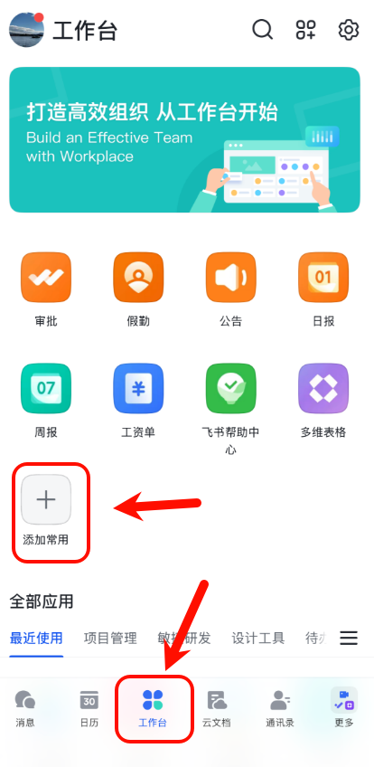 1. 在飞书手机版- 工作台 -【+】搜索自建的应用名,添加到常用。