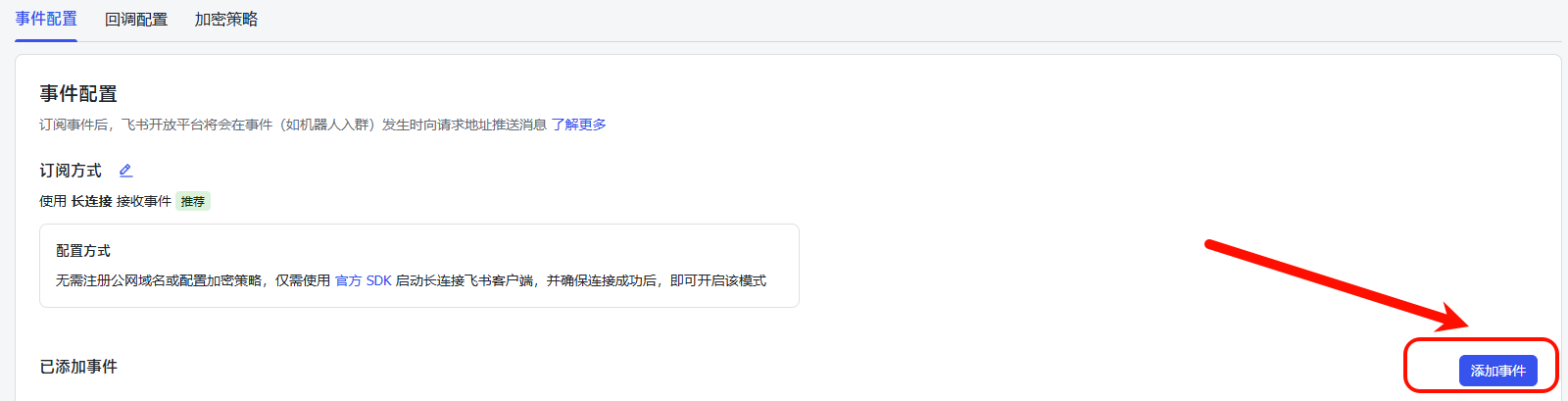 2. 事件订阅:启用事件订阅,添加 “im.message.receive_v1”(接收消息事件),国内用户暂不配置 Request URL,选择 “长链接” 接收方式,避免公网 IP 配置难题;