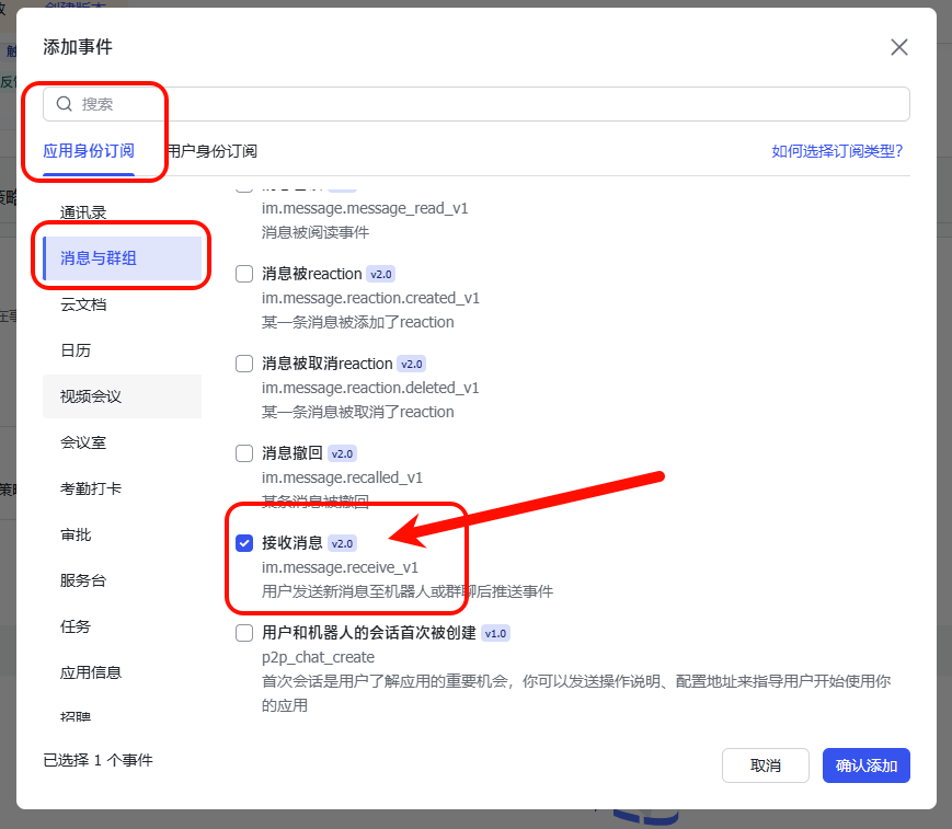 4. 选择【添加事件】,在应用身份订阅栏,找到“接收消息”。确认添加。