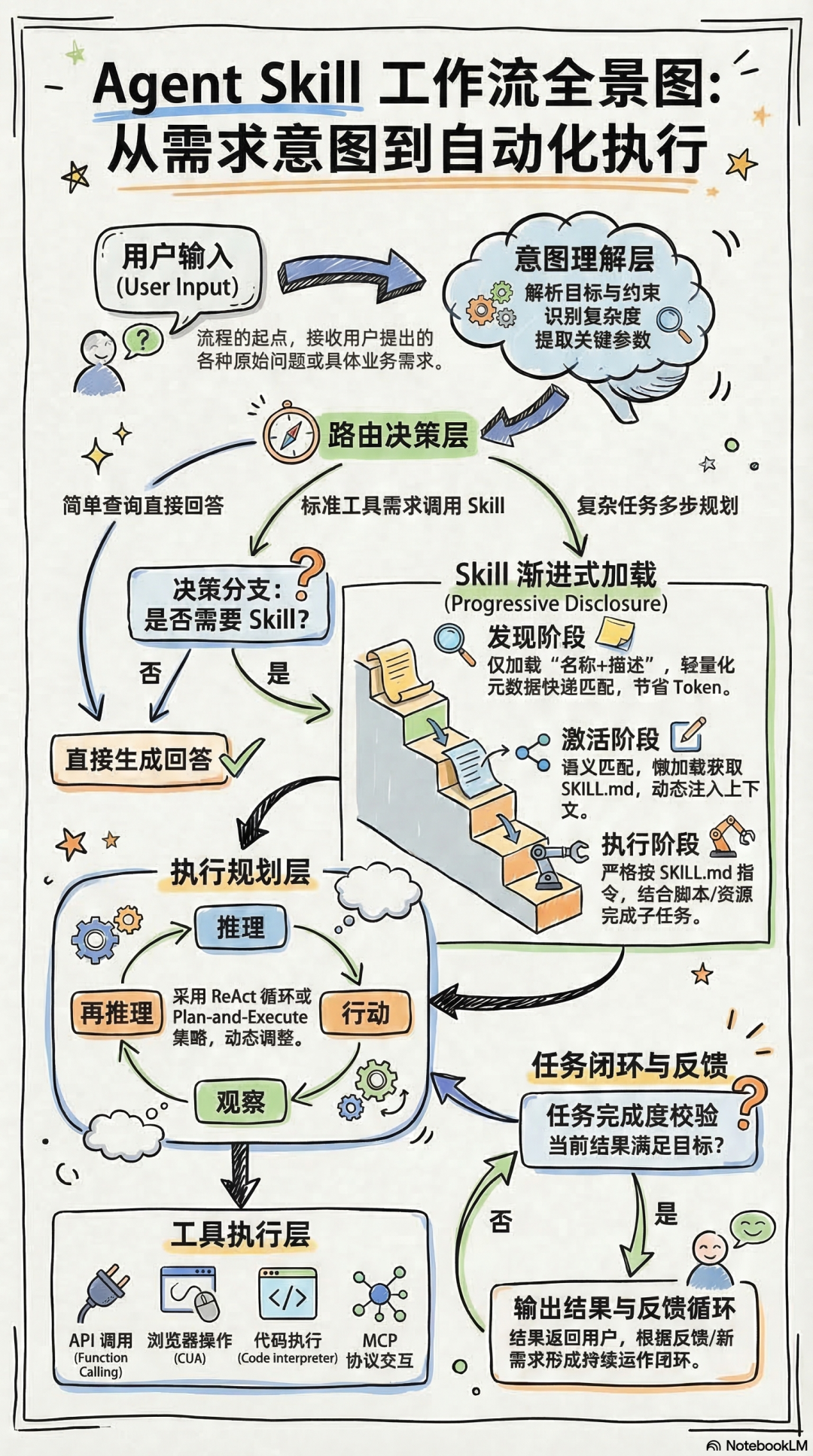 “Agent Skill 工作流”展示了一个严密的逻辑闭环:从精准的意图理解出发,经过高效的路由决策,在渐进式加载的资源优化下,通过 ReAct 规划与多维度工具执行,最终由反馈机制驱动持续迭代。