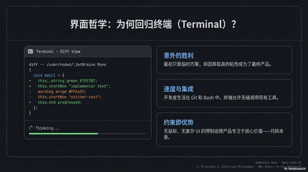 为什么在 2025 年,我们依然要回归终端?Boris 认为,终端的极简主义(80x100 字符限制)不是枷锁,而是催化剂。