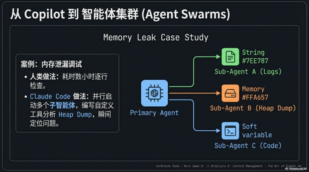 通过生成多个拥有清新、未受污染上下文的子代理,模型可以避免在单一窗口中因信息过载而产生的“幻觉”。这是一种极其高效的推理时计算(Test-time compute)。一个经典案例是:Claude Code 的整个插件系统,就是由这样一个“智能体蜂群”在一个周末内,通过自动拆解任务、互发消息、调用工具独立完成的,几乎没有任何人类干预。
