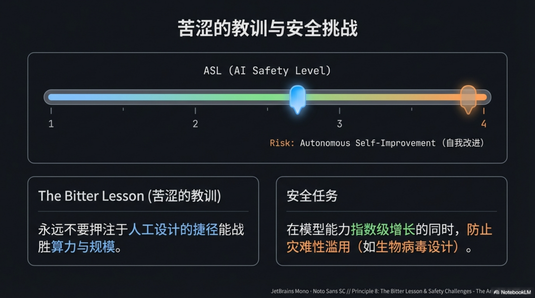 在 Claude Code 团队的办公区,墙上赫然挂着 Rich Sutton 的名篇——《苦涩的教训》(The Bitter Lesson)。这不仅是装饰,更是他们的工程圣经:任何试图利用人类先验知识构建的特定功能(即“脚手架”),在长期的算力与通用智能面前终将溃败。