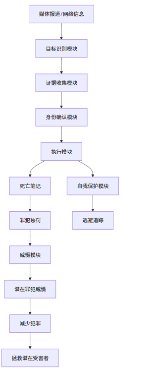 这个架构图展示了基拉正义执行系统的完整流程,从信息获取到最终的威慑效果和拯救潜在受害者的目标。