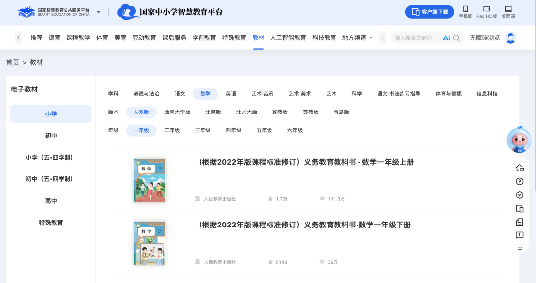 在 国家中小学智慧教育平台( https://basic.smartedu.cn/tchMaterial )注册登录后,可以在线查看国内中小学的各科多版本的电子教材,但网站内并未提供下载方式: