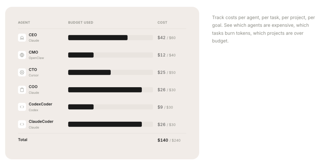 在 Paperclip 里,你可以给每个Agent设置月度预算。一旦预算花完,Agent就会自动停工,不会再继续烧钱。
