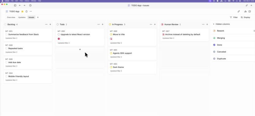 Symphony 会自动监控项目看板(目前支持 Linear),当有新任务出现时,它会自动派出智能体去处理。整个过程不需要人工触发,完全自动化。