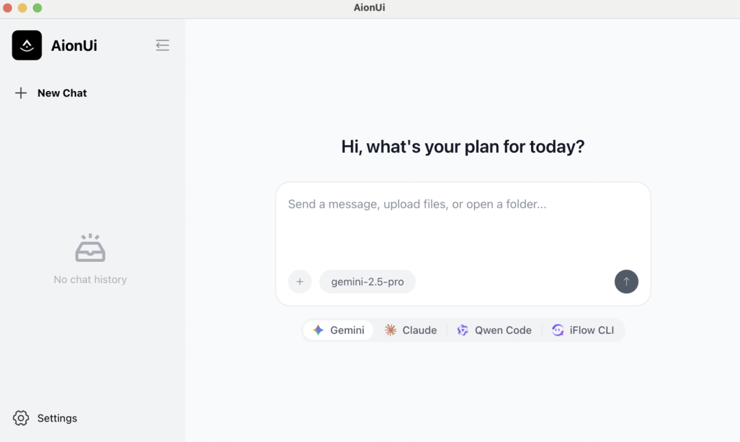安装完成后,启动默认界面就是 Gemini CLI 模式,这是 AionUi 的内置 Agent。