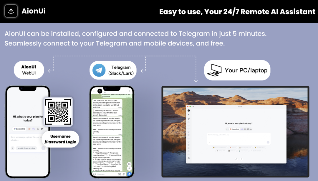 支持从任何设备、任何地方访问 AionUi!随时随地通过 WebUI 或 Telegram 使用你的 AI 工具。