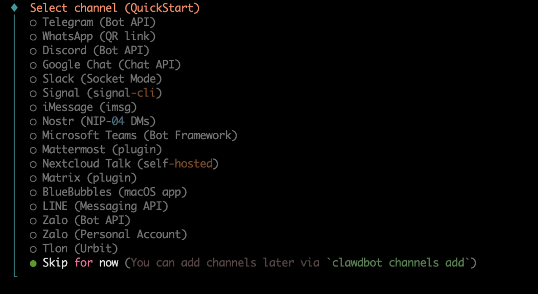 然后就到了选择聊天渠道这一步了,我们直接选择最后一个跳过,因为我们今天的第二主角是飞书呀。(后续如果想添加这上面的应用,再手动添加就行)