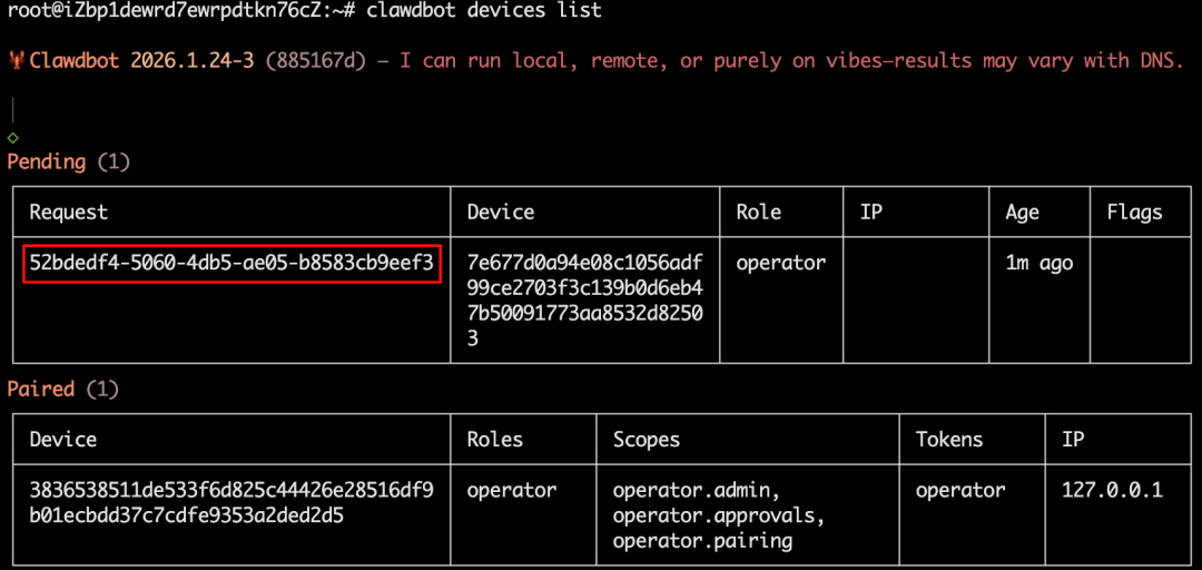clawdbot devices approve 52bdedf4-5060-4db5-ae05-b8583cb9eef3