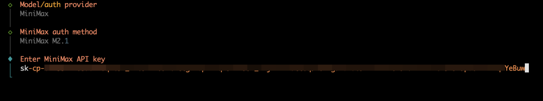 回车选择 MiniMax M2.1 模型,将 API Key 粘贴上去。