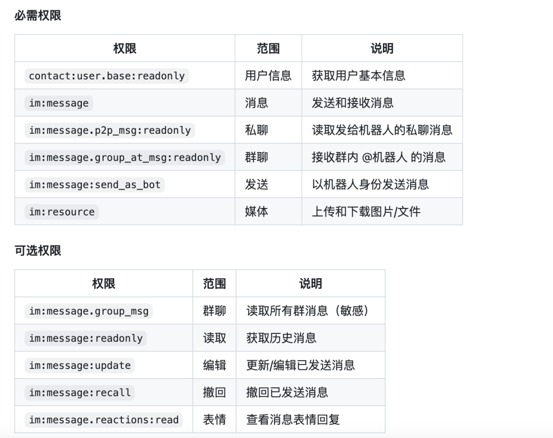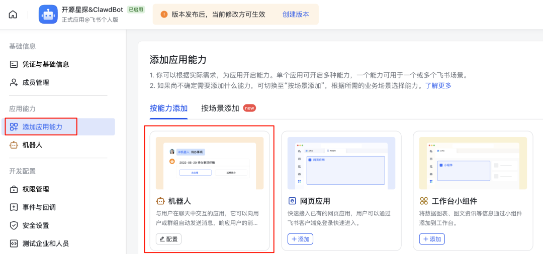其中有些权限,需要你开通Bot能力才允许你开通权限。只需要点击添加应用能力-添加机器人即可。