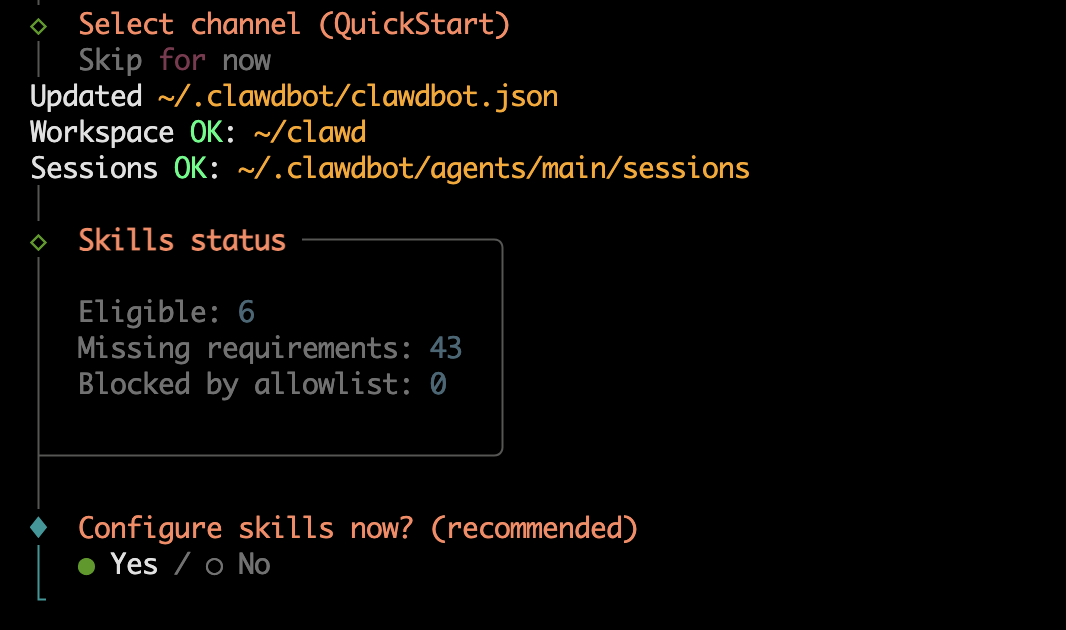 然后它会问你,需要配置 Skills(技能)吗?这里看个人了,我还是Yes继续。
