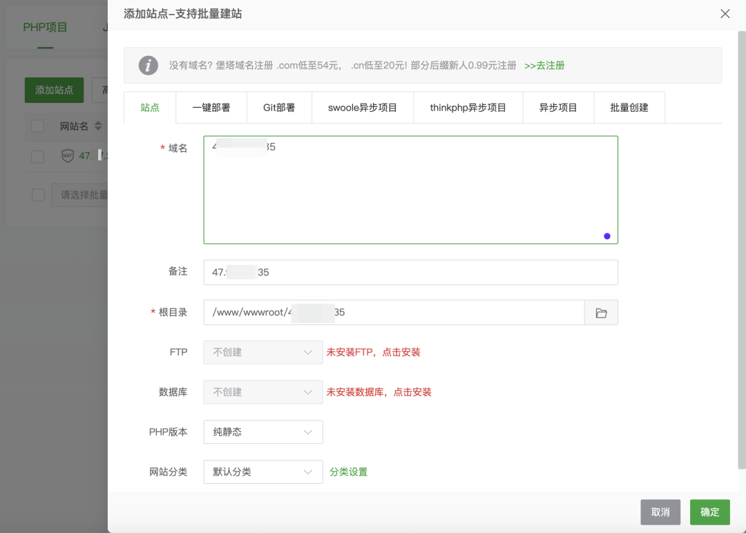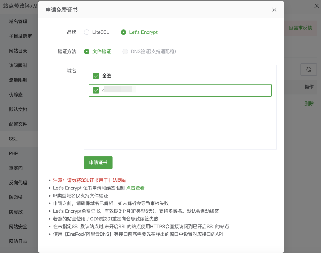 先要添加网站(站点),可以填域名,没域名就填IP地址。
