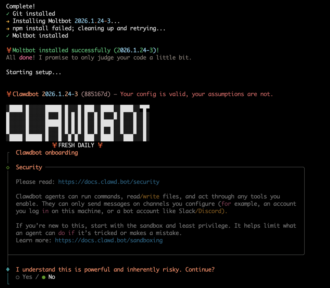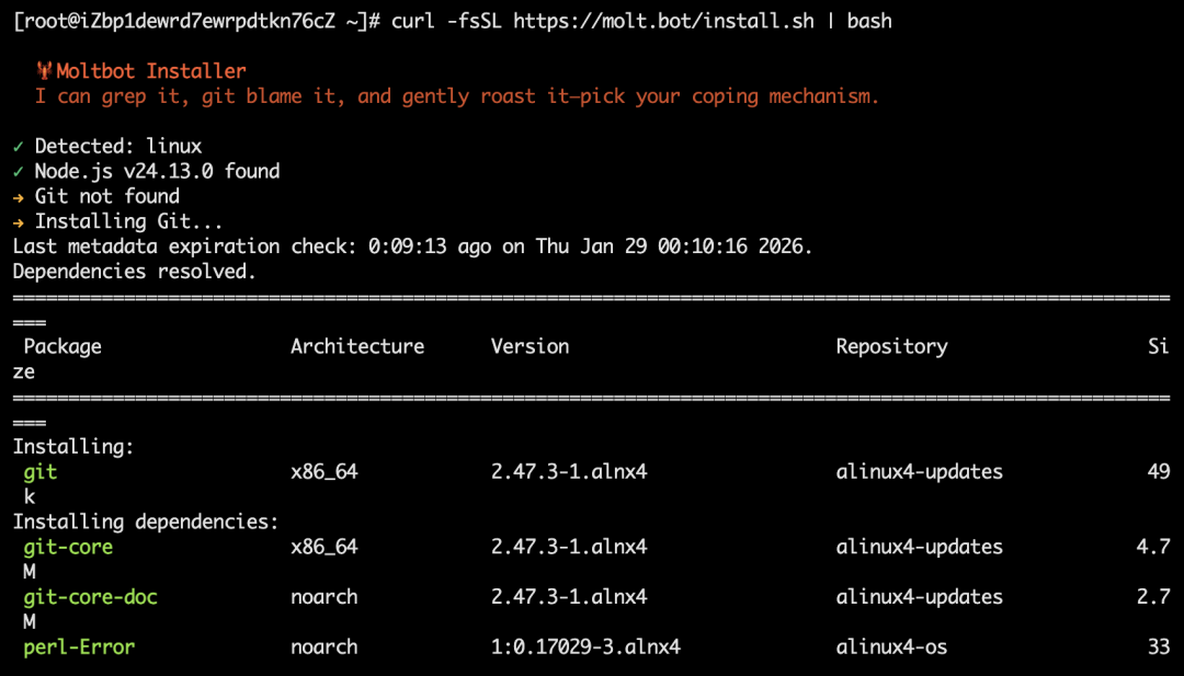 curl -fsSL https://molt.bot/install.sh | bash这个安装过程,它会自动安装依赖的环境和软件包,接下来我们需要等待它完成安装。