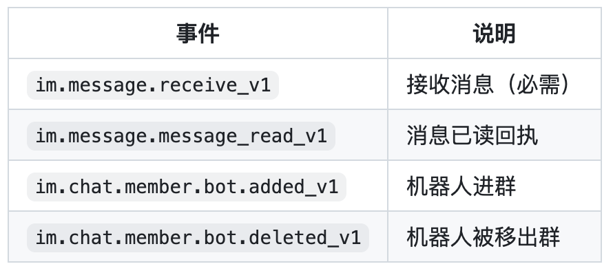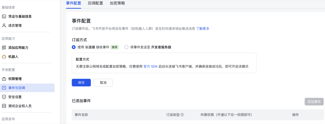 权限开通完成后,我们需要进行事件订阅(这个非常重要)。在「事件与回调」页面,选择 使用长连接接收事件(推荐),添加事件订阅,勾选以下事件: