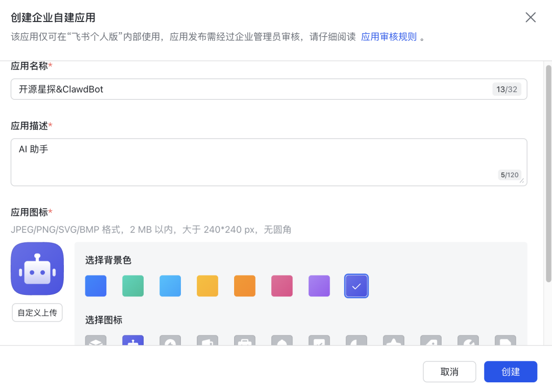 npm install @m1heng-clawd/feishu在 飞书开放平台[4] (open.feishu.cn)创建自建应用。