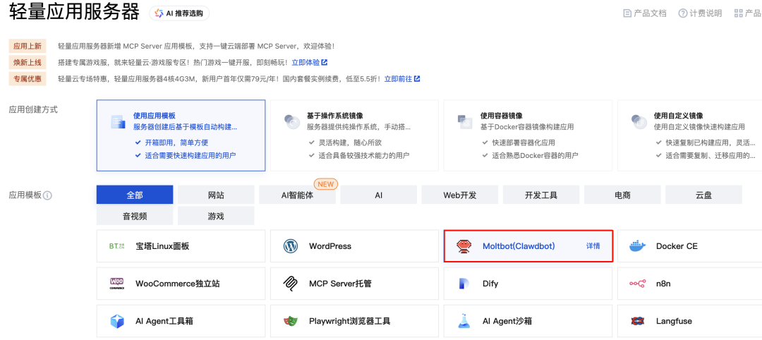 如果还想再省事,像腾讯云也是紧跟潮流,直接上了 Moltbot 开箱即用的应用模板,每个月38块还能接受,就在轻量应用服务器类型中。(阿里云也上了 Moltbot 轻量应用,不过价格贵点)