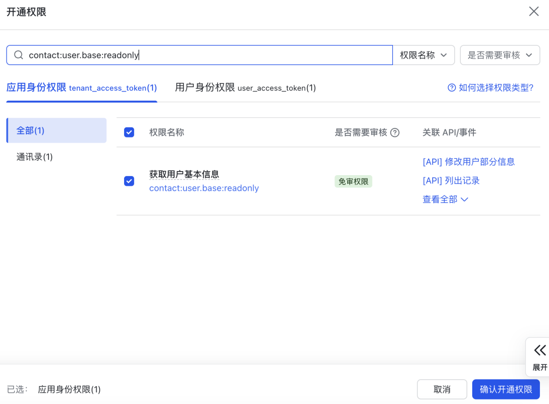 开启所需权限,点击权限管理-开通权限,搜索下方的权限名进行开通。