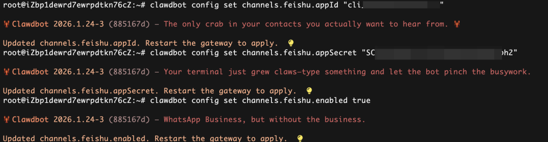 然后执行下面3条命令进行Clawdbot飞书配置: