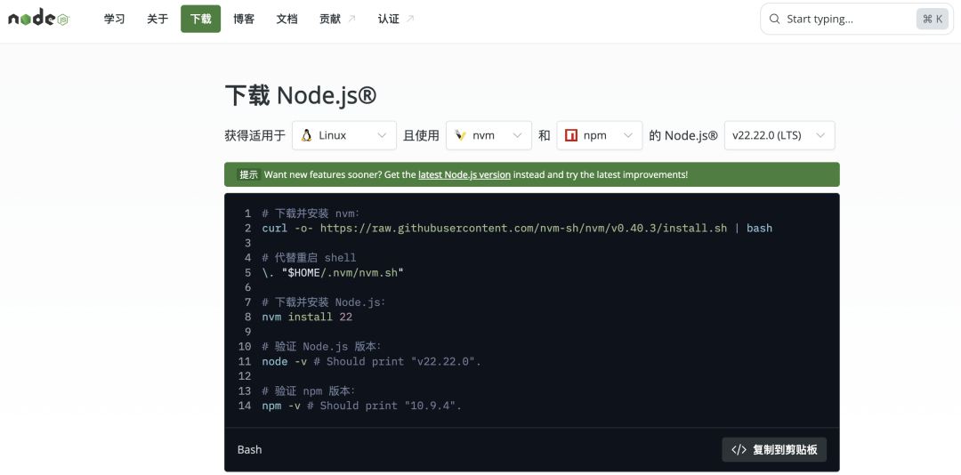 其次 Moltbot 依赖于 Nodejs 基础环境,需要提前安装一个版本>22的 Nodejs[2] 环境。