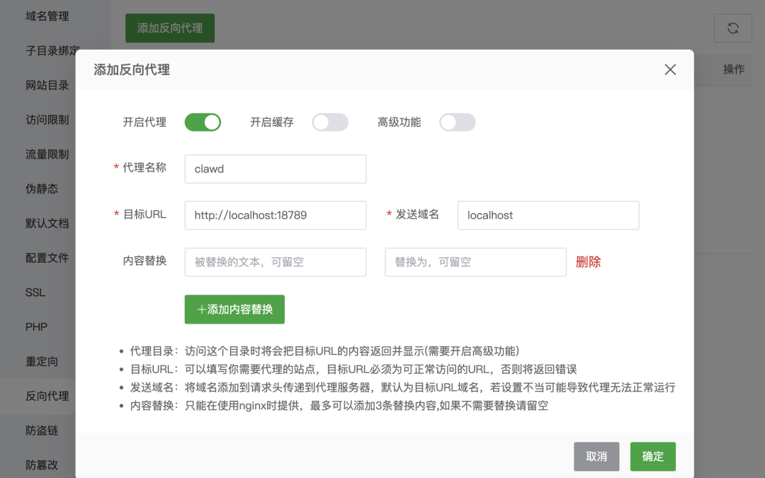 添加反向代理,使用 Moltbot 的地址。
