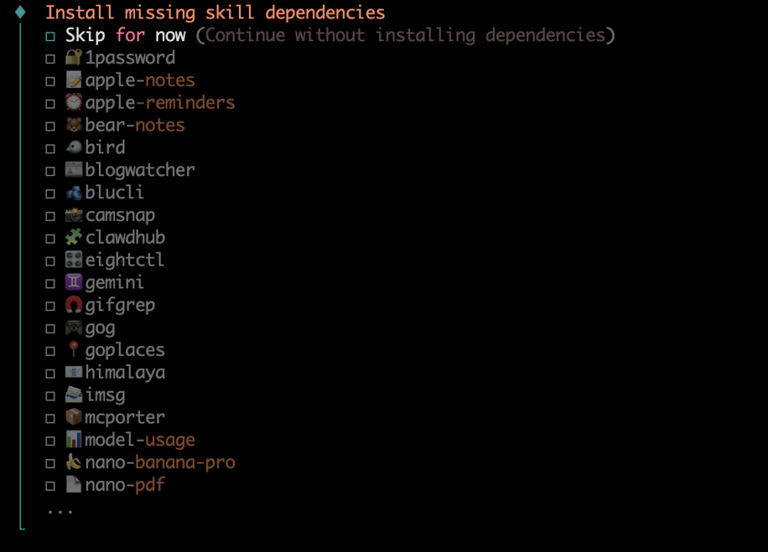 然后给你罗列出一堆Skills,可根据自己需要进行选取安装,如果没有想要的技能也可以跳过,继续下一步。