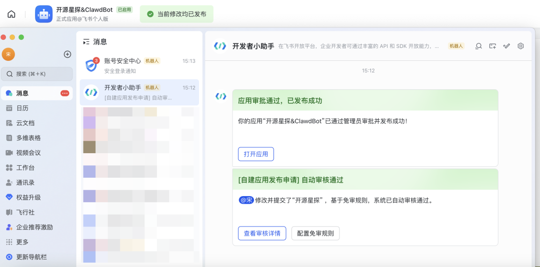 当然最后别忘了,把你的飞书机器人发布上线(可以当做Beta测试)。发布后你在飞书APP或客户端也能够收到消息通知。