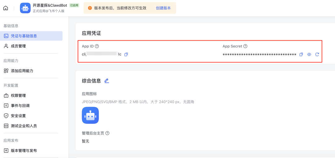 来到了最关键的飞书机器人接入环节,说实话上面的反向代理太TM搞人了,真没有本地方便呀,折腾了一晚上加一上午,已经没力气了。