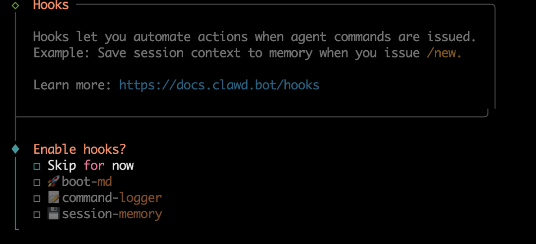 boot-md:作用是启动时自动加载一段markdown文本当作默认引导内容,常用于把你的规则、偏好、项目背景这些在每次启动时塞进去。command-logger:是把你在 Moltbot 里执行过的命令和关键操作记一份日志,方便排查问题和复盘。session-memory:保存会话相关的状态或记忆,让它下次能延续上下文,体验会更连贯。