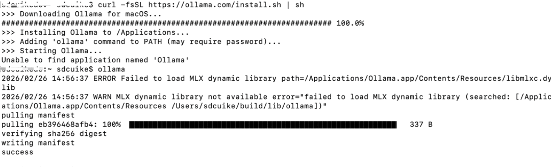 .zip 文件解压,把 Ollama 图标拖入“应用程序”文件夹。打开终端,复制粘贴以下一行命令并回车(需要输入密码):