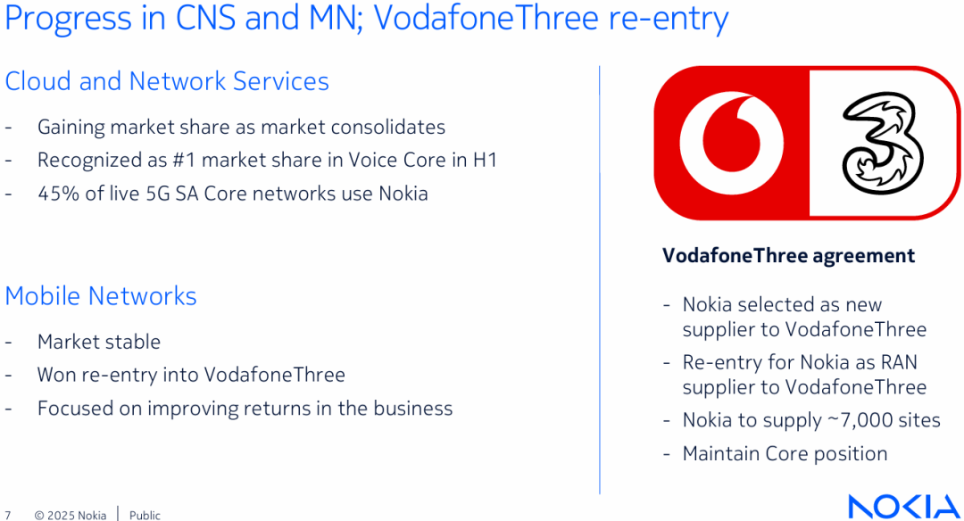 从网络基础设施到云与网络服务,再到移动网络,诺基亚的所有业务组都贡献了增长,特别是云与网络服务的13%的增长,反映出诺基亚5G核心的强劲投资需求和行业竞争力。诺基亚的云原生5G核心解决方案持续获得市场认可,甚至在2025年上半年已经在Voice Core领域拿下了市场份额第一的位置。这个成绩单背后,是诺基亚多年技术积累的沉淀,也是它敢于冒险进行业务转型的结果。