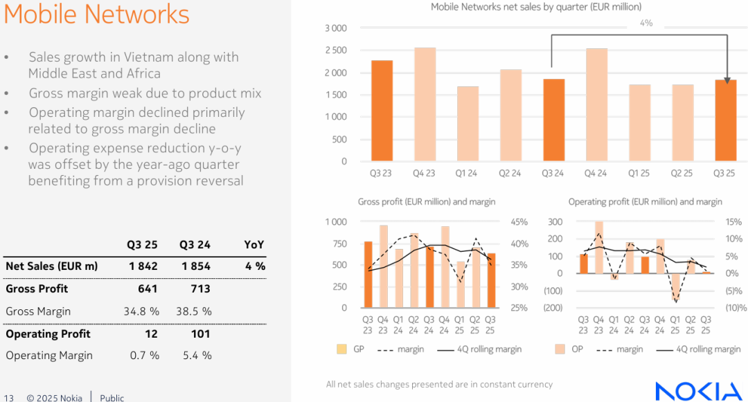 不过,挑战也不可忽视。诺基亚的毛利率同比下降了150个基点,主要是由于移动网络产品结构的调整和网络基础设施产品的产品组合效应。虽然产品组合发生了变化,诺基亚依然在多个核心领域保持稳定的收入增长,但在竞争激烈的环境下,价格压力依然存在,尤其是在移动网络领域,虽然有些增长,但这并不代表它能够在每个市场上都领先。毕竟,全球的通信市场正在经历着“技术更迭速度加快,成本控制变得更加重要”这些前所未有的变化。