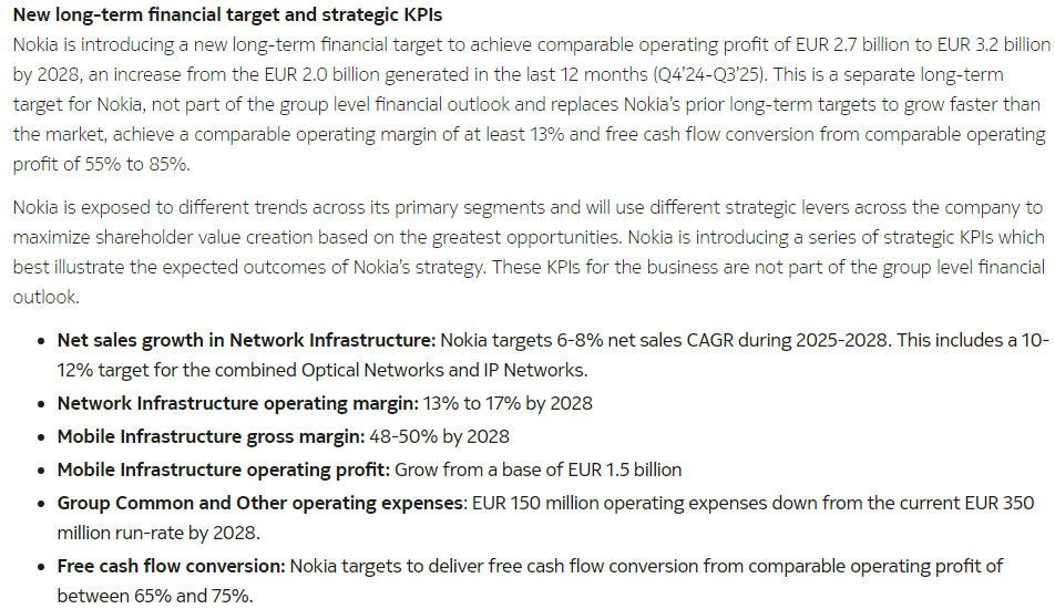 因此,在2025年11月19日的诺基亚2025资本市场日( Capital Markets Day 2025 ),宣布了组织架构调整计划,旨在引领人工智能驱动的网络转型,并抓住AI超级周期带来的价值,使诺基亚走上更加强劲的创新之路,更好地服务客户并创造股东价值。然后制定KPI目标到2028年,将诺基亚年度可比营业利润增长至27亿至32亿欧元的区间。