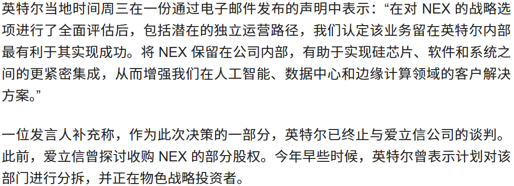 4. 盈利与价值角度:虽然英特尔重组之后停止单独披露,但已知历史数据表明 NEX 本身并不亏损,且具备可观的战略溢价。