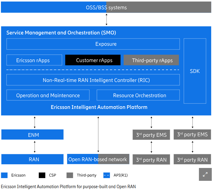 放在这个时间窗口里,再看看爱立信在欧洲的持续深耕,再看爱立信的EIAP,一下子“天时地利人和”全满足了。EIAP 全称Ericsson Service Management and Orchestration,是爱立信公司自主研发的一个承载自动化逻辑的平台环境,外加一套相对开放的生态机制,真正跑在上面的,是一个个rApps。每个 rApp 解决一个相对明确的问题,比如异常检测,能耗优化,而不是试图用一个模型解释整个网络。