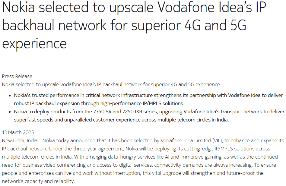 2025年3月,诺基亚布局全球经济高速增长的热土印度,在沃达丰创新公司(Vodafone Idea Limited,简称VIL)的总部,诺基亚与印度电信巨头VIL公司握手签约,三年的传输网络升级协议将决定这片通信热土的未来蓝图,这一协议无疑是诺基亚对于印度市场的重要布局。印度,这个全球通信增长最快的市场之一,市场庞大且复杂,充满了机遇与挑战。在过去几年里,某H厂与某Z厂争先恐后地涌入,而诺基亚凭借其在光网络与IP/MPLS解决方案方面的技术积淀,牢牢抓住了这个机会。